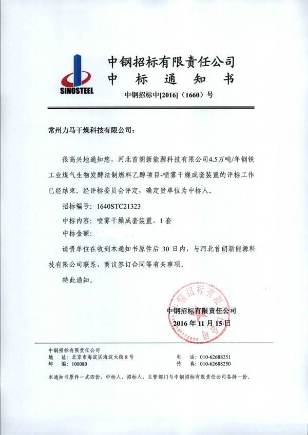 经过公开招标,首钢公司发酵废液的深化处理,转化成蛋白饲料用特大型喷雾干燥机组,^终定标,在众多的参与投标的入围企业中,力马企业一举中标,中标金额巨大。